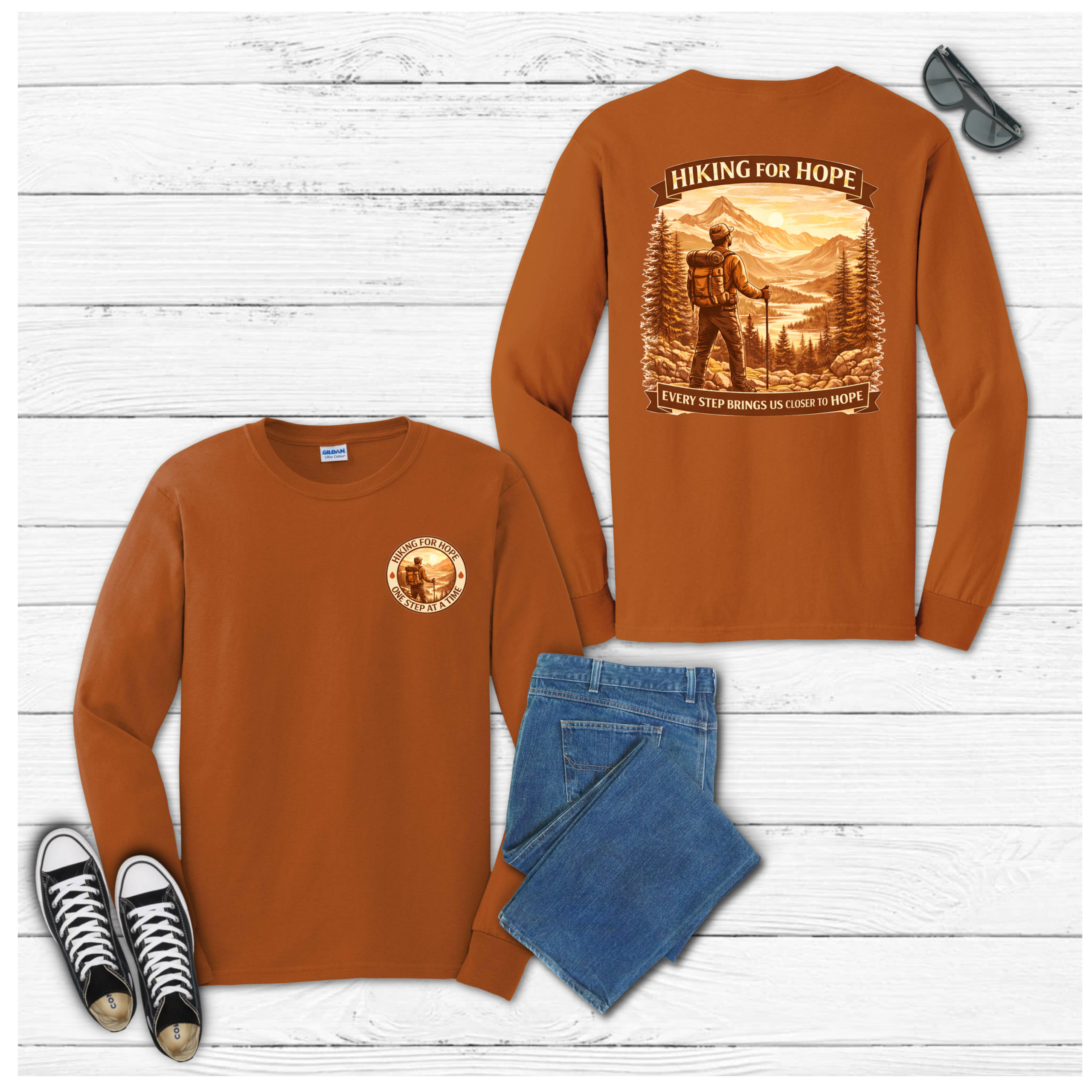 Bright Texas orange long sleeve shirt featuring the HFH design. Comfortable for everyday wear, shipped securely in a 12″ × 10″ poly mailer.