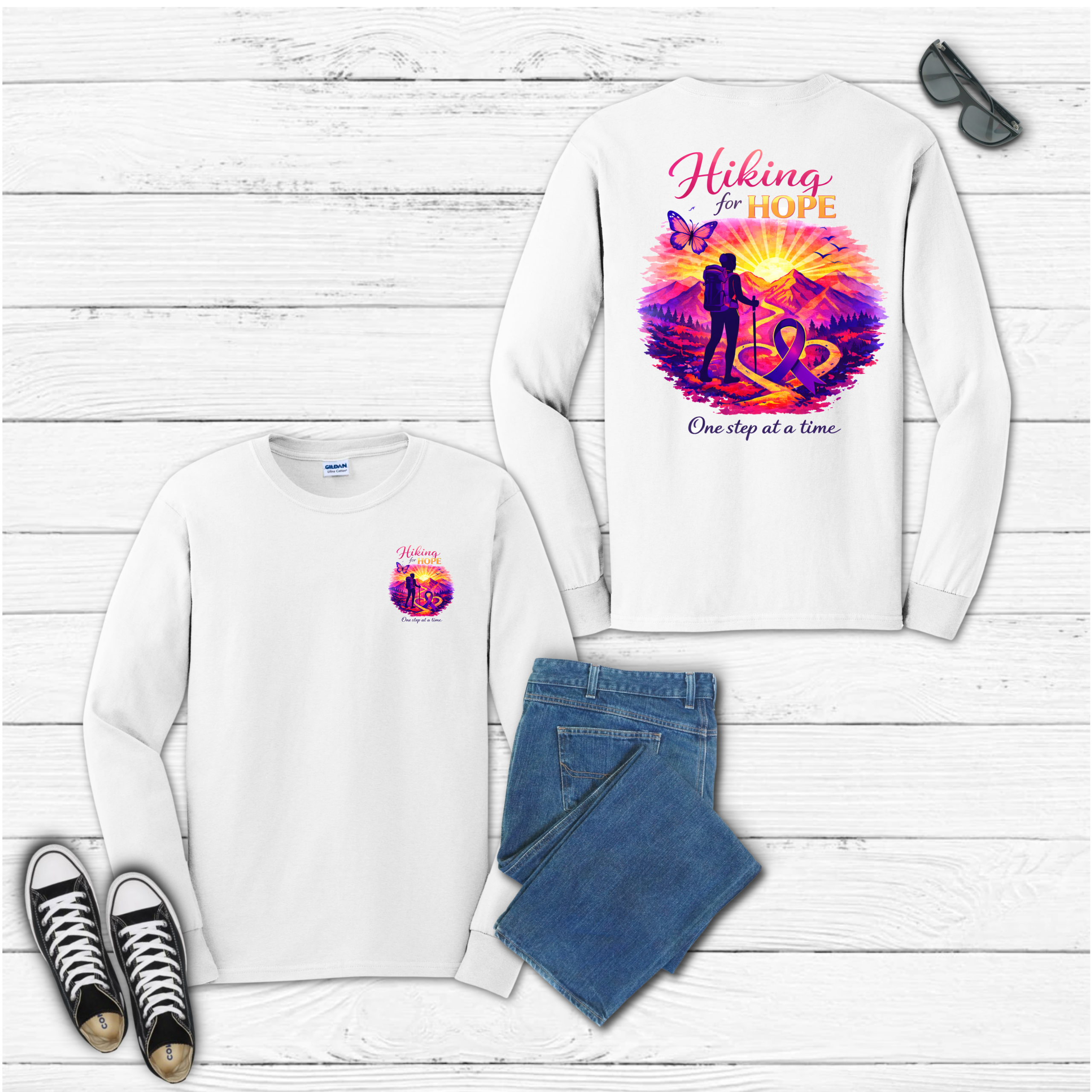 Soft white long sleeve t-shirt featuring a vibrant HFH design in hot pink and other colors. Perfect for casual wear, shipped safely in a 12″ × 10″ poly mailer.